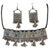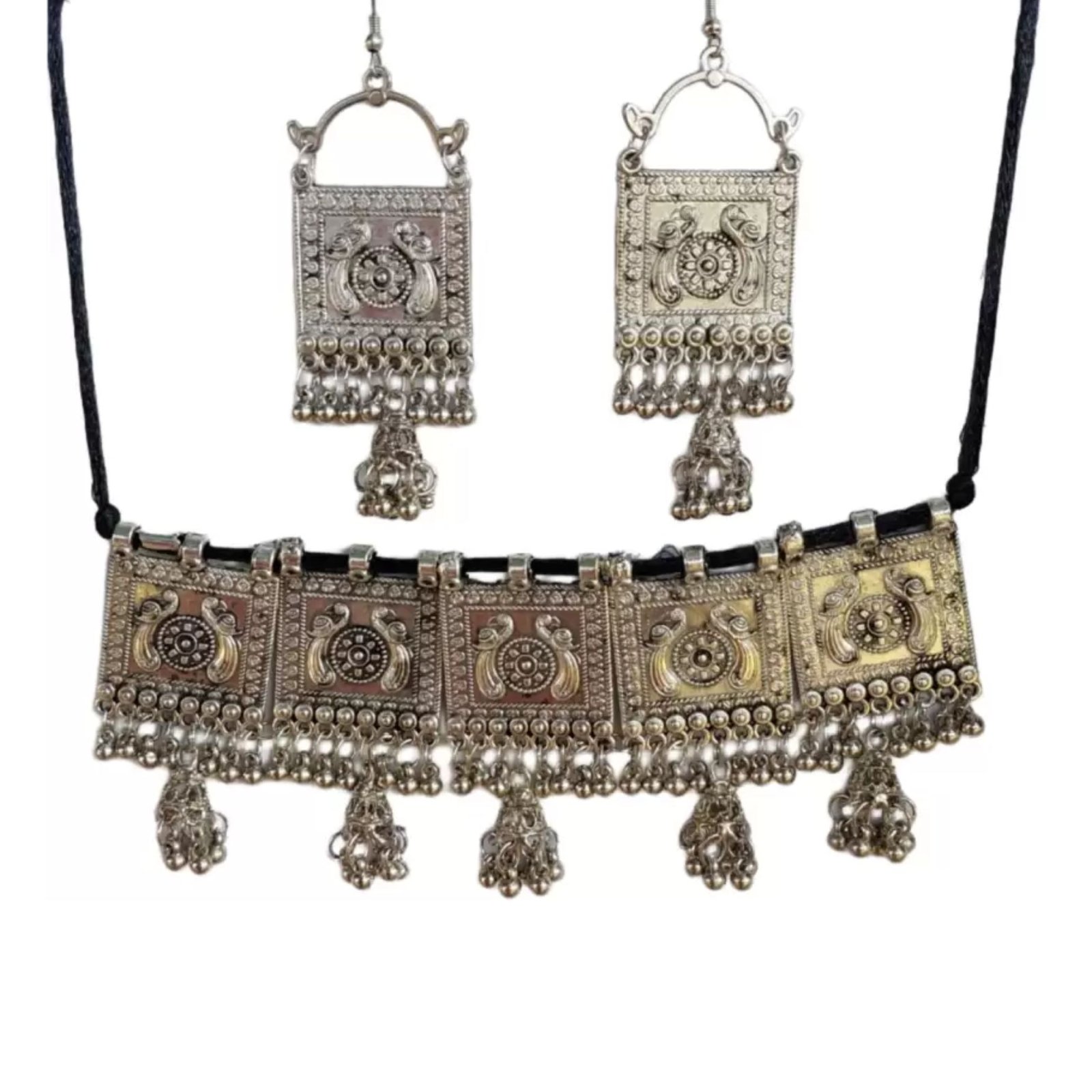Introducing our exquisite Oxidised Silver and Black Jewel Set, a perfect combination of elegance and style. This set includes a choker and two matching earrings, designed to elevate your look for various occasions.